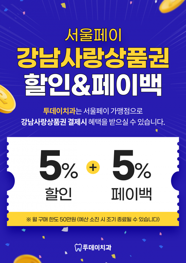 서울페이 강남사랑상품권 결제 시 5% 할인 + 5% 페이백 혜택 안내 페이지 정보 작성자 투데이치과 작성일26-03-04 15:26 조회385회 댓글0건 관련링크 다음글 목록 본문 안녕하세요. 투데이치과입니다.투데이치과는 서울페이 강남사랑상품권 가맹점으로강남사랑상품권으로 결제하실 경우 5% 할인 + 5% 페이백 혜택을 받으실 수 있습니다.자세한 내용은 이미지 안내를 참고해주시기 바랍니다.※ 월 구매 한도 50만원 (예산 소진 시 조기 종료될 수 있습니다)감사합니다. 다음글 목록